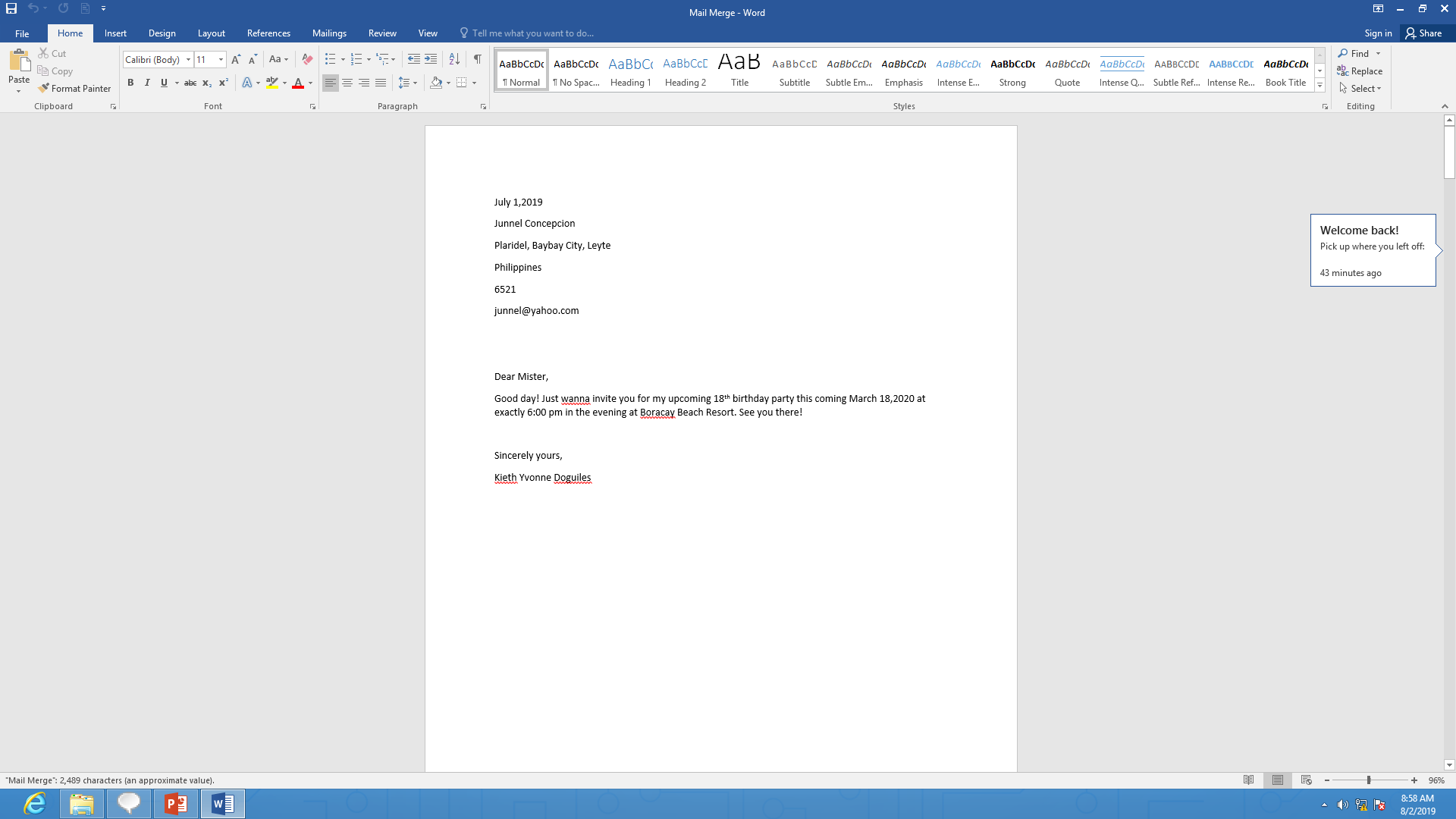 Exercise No.1 Mail Merge